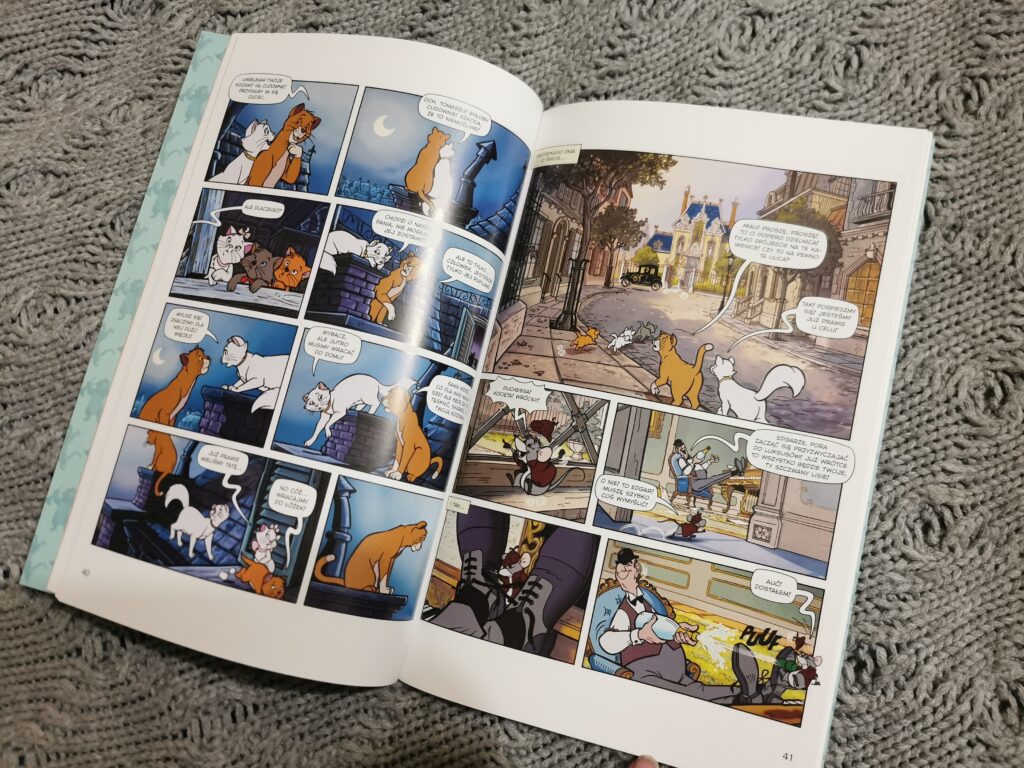 Przekładanie klasyków Disneya na komiksowe ramy to niezwykle wdzięczna praca, bo nie ukrywam, że dawne animacje miały w sobie coś wyjątkowego. Duszę i niepowtarzalny klimat. Mimo że ówcześni animatorzy często szli na skróty, wielokrotnie wykorzystując te same kadry czy ruchy postaci, dla mnie właśnie te filmy są kwintesencją jakości i piękna tradycyjnej animacji. Zaglądając do komiksu „Aryskotraci”, muszę przyznać, że rysownikowi udało się oddać to niesamowite ciepło i atmosferę oryginału.