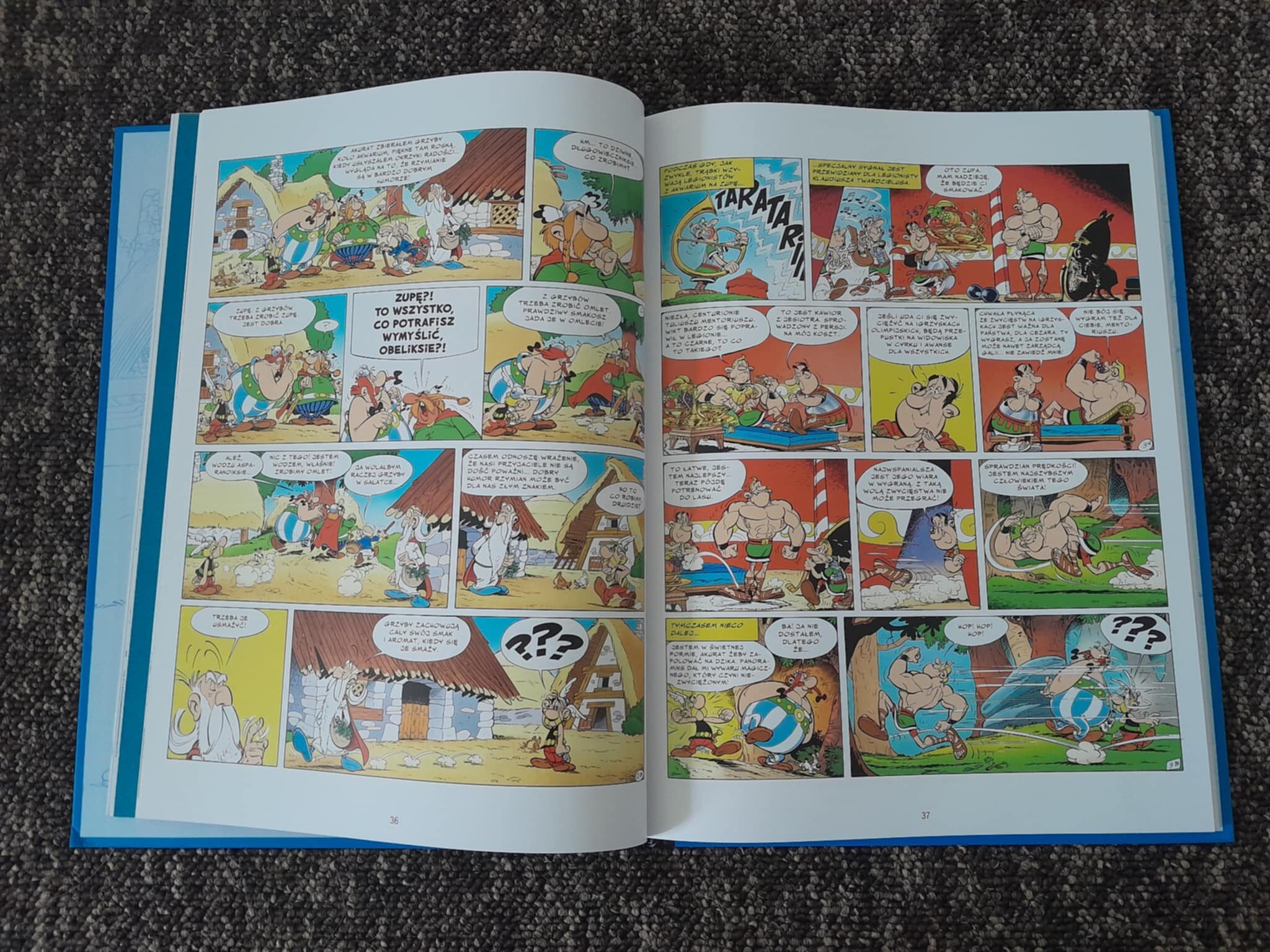 Nowe wydanie komiksu zachwyca wyglądem. Pierwszą rzeczą, która przyciąga uwagę, jest twarda, intensywnie niebieska okładka. Po jej otwarciu zauważamy papier ilustracyjny wysokiej jakości, który pięknie eksponuje ilustracje Uderzo. Oprócz samego komiksu znajdziemy tutaj wiele dodatków, takich jak plakaty, przedruki notatek i szkiców. W środku umieszczono też liczne ciekawostki omawiające różne aspekty wpływające na twórczość autorów. Mamy okazję poznać kontekst wydarzeń z 1968 roku, a także przeczytać wypowiedzi Goscinnego i Uderzo dotyczące ich dzieła, które zostały wyciągnięte z różnych wywiadów na przestrzeni wielu lat. Pojawia się również wątek historyczny, który pokazuje, jaką wiedzę o starożytnych igrzyskach posiadali twórcy, a także co zostało przez nich uproszczone.