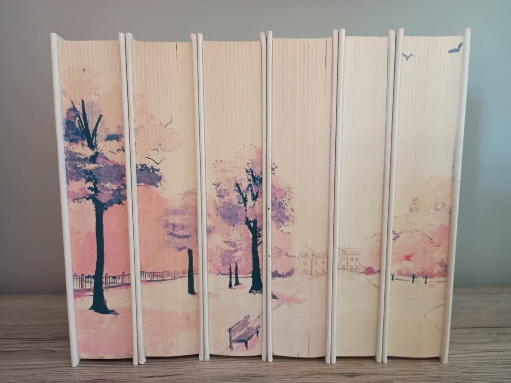 Spójrzcie tylko na zdjęcia. Czy to wydanie nie jest piękne? Urzekły mnie te delikatne, malowane, pudrowe brzegi. Pomimo tego, że każda z książek ma inny kolor, elementy zawarte na ich grzbietach i okładkach idealnie ze sobą współgrają. Nie wiadomo, którą stroną postawić książki, bo z każdej będą cieszyć oko. Okładka szóstego tomu ma piękny, pomarańczowy kolor i uważam, że jest najładniejsza z całej serii. Tak jak w każdym wydaniu, tekst jest napisany większą czcionką, co jest ogromnym plusem, zwłaszcza dla osób, które na co dzień spędzają dużo czasu przed ekranem telefonu. Dodatkowo bardzo podoba mi się odcień papieru. Zdecydowanie wolę go od jaskrawo białych kartek, które często są męczące dla oczu. Ten subtelny odcień żółci jest bardzo przyjemny i sprawia, że czytanie staje się jeszcze bardziej komfortowe.