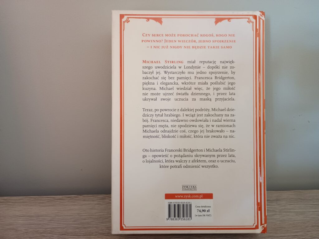 Francesca Bridgerton wiedzie spokojne i szczęśliwe życie u boku swojego męża Johna Stirlinga. Szczęście Lady Kilmartin nie trwa jednak długo. Cicha choroba niespodziewanie zabiera jej męża. Michael Stirling, kuzyn Johna i przyjaciel jego żony, zakochał się w niej od pierwszego wejrzenia. Uczucia te skrywał w sobie przez kilka lat. Zapraszam na wrażenia z opowieści, która zgłębia żałobę po stracie ukochanej osoby i przybliża nam zakazaną miłość.