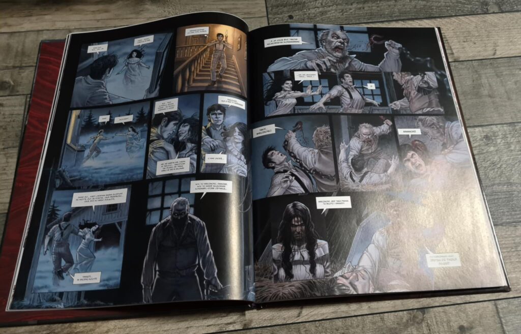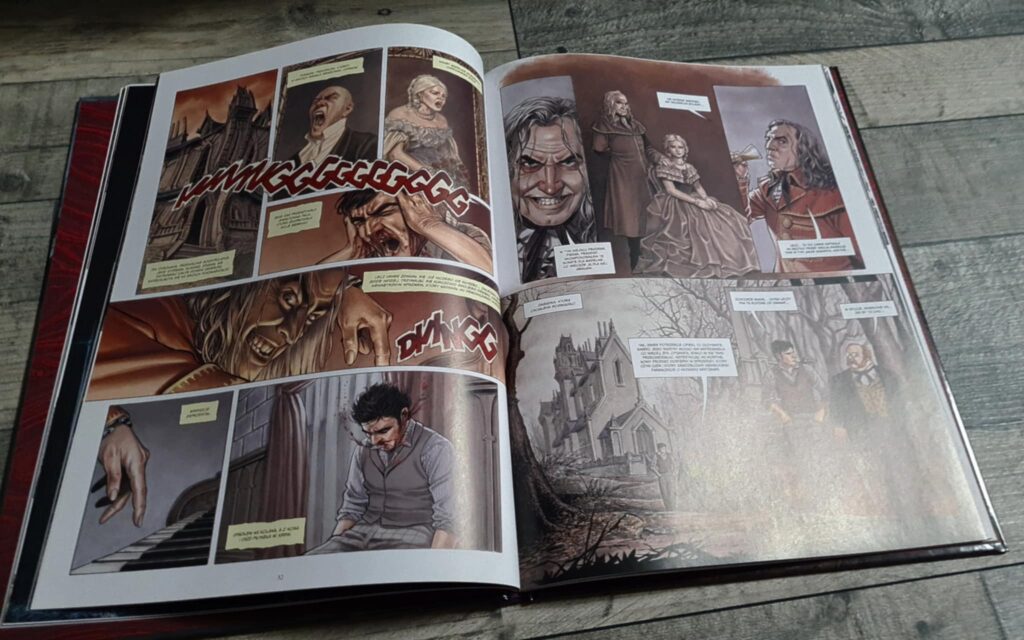 Choć znacząca część historii jest wariacją na temat „Zagłady domu Usherów”, na kartach komiksu pojawiają się cytaty z innych dzieł, co może być gratką dla fanów autora. Od samego początku spodobała mi się strona wizualna komiksu, która jak dla mnie idealnie odzwierciedla gotyckie opowieści. Jest mrocznie, ponuro i tajemniczo a groza zdaje się podążać za bohaterem w formie coraz bardziej upiornych scen. Postacie wyglądają realistycznie a zbliżenia na ich twarze i detale pozwalające odczytać emocje naprawdę robią wrażenie. Natomiast Jakub Syty odpowiedzialny za przekład komiksu zdecydowanie oddał klimat opowiadanej historii.