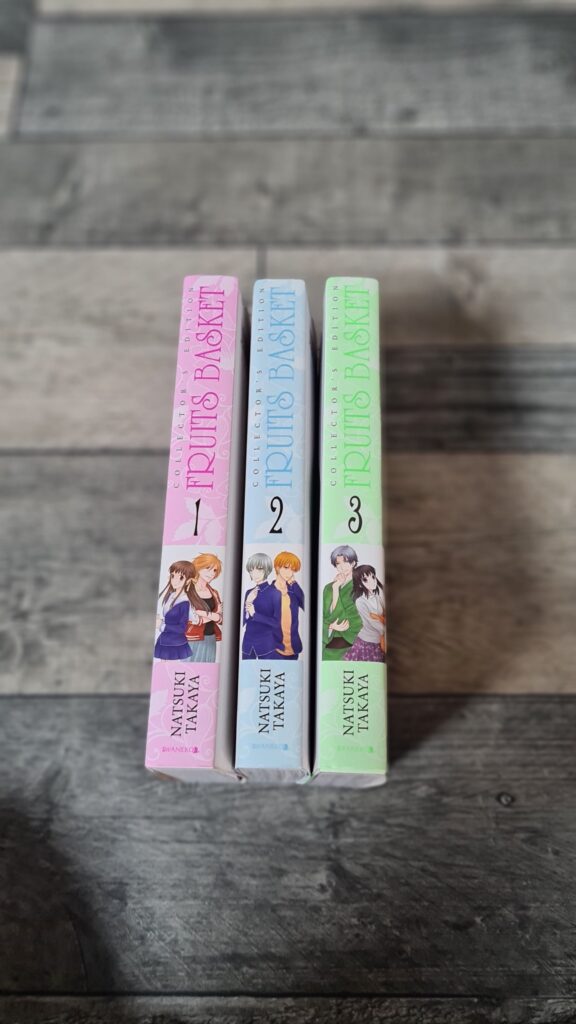 „Fruits Basket” wydane przez Waneko to wersja Collector’s Edition łącząca dwa tomy w jednym. Oprawa miękka z obwolutą. Co ciekawe, jeśli mnie wzrok nie myli, obwoluta przedstawia odświeżone wizerunki bohaterów, bliższe wyglądem do tych z anime z 2019 roku. Na każdej obwolucie mamy po dwoje bohaterów, a pod obwolutą jest ta sama ilustracja w kolorze zgrywającym się z napisem i grzbietem mangi. Na skrzydełkach obwoluty również są rysunki. W środku znajdziecie kilka kolorowych ilustracji. Wydanie jest piękne i świetnie się prezentuje. Jedyne czego mi szkoda, to to, że format nie jest trochę większy albo twarda oprawa. Jako osoba, która nie lubi łamać grzbietów książek czy mang, musiałam się sporo nagimnastykować żeby tego uniknąć. Jeśli jest Wam to obojętne z pewnością przeczytacie historię szybciej niż ja.