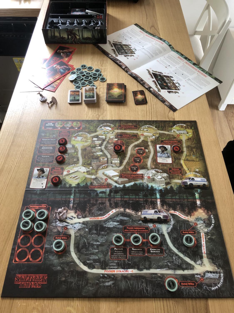 Gra planszowa „Stranger Things – Po Drugiej Stronie” została wykonana z dużą dbałością o szczegóły. Całość została zamknięta w stosunkowo niewielkim kartonowym pudełku, jednak po jego otwarciu ukazują nam się dokładnie poukładane wszystkie komponenty, gdzie każdy z nich ma swoje właściwe miejsce – dwustronna mapa świata, która pozwala odtworzyć scenariusze z pierwszego lub drugiego sezonu produkcji, pięć rodzajów kart – karty akcji, karty scen, karty przedmiotów, karty sojuszników oraz karty postaci, którymi przyjdzie nam grać.