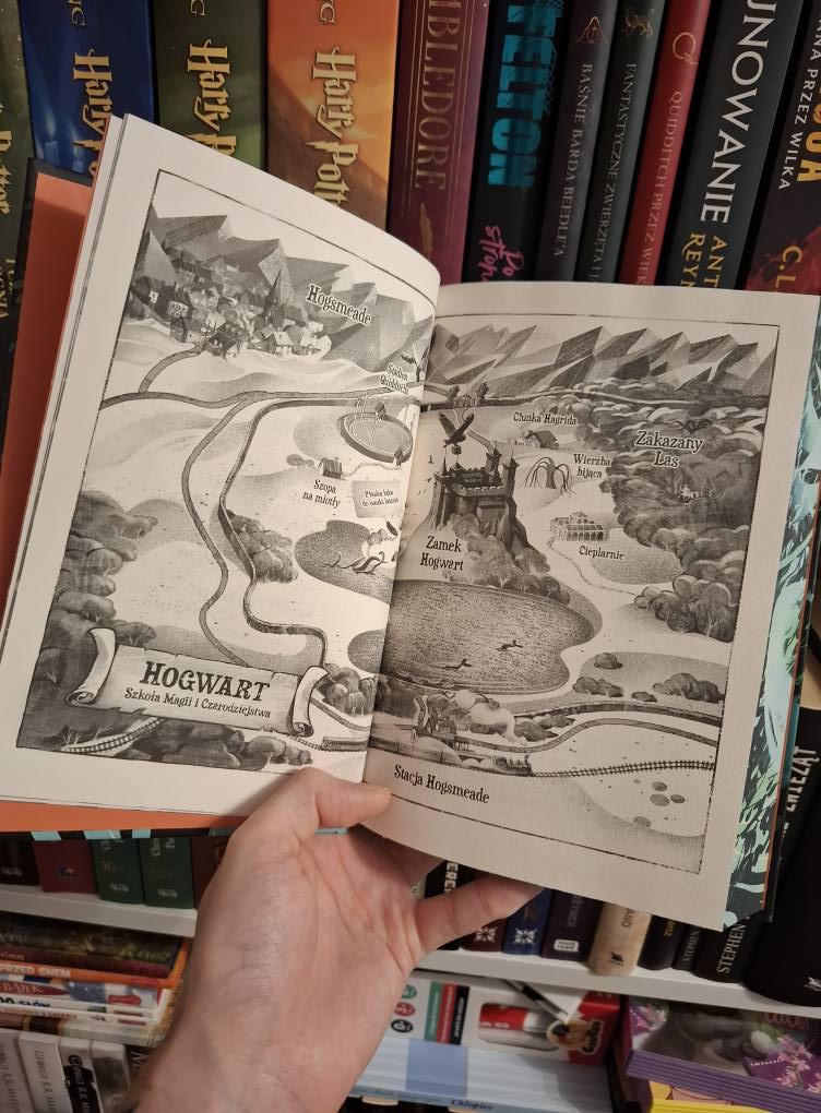 Każdy rozdział ozdobiono unikalną grafiką utrzymaną w stylistyce okładki oraz dopasowaną czcionką, co tworzy wyjątkowo spójną kompozycję. Te małe detale składają się na edycję, która ma własny charakter i autorską duszę. Na szczególną uwagę zasługuje również mapa Hogwartu na początku książki, dzięki niej łatwiej wyobrazić sobie rozmieszczenie poszczególnych miejsc i w pełni zanurzyć się w świecie magii. Co istotne, Kaja Bajowska stworzyła własną interpretację zamku, nie kopiując znanych filmowych ujęć. Najlepiej widać to choćby po chatce Hagrida, która wygląda zupełnie inaczej niż w ekranizacji, ale zachowuje swój urok.