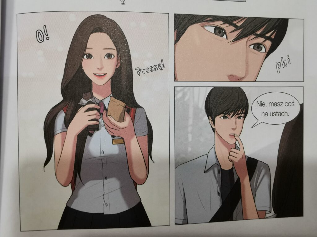 Na koniec parę słów o polskim wydaniu. Ogólnie nie mam się do czego przyczepić, to bardzo estetycznie wydana manhwa. Format, jak zawsze powtarzam, to kwestia gustu, ja za tak dużym formatem nie przepadam, ale wiem, że dla wielu osób będzie to zaleta. Tłumaczenie również nie pozostawia nic do życzenia. Jednak jest jedna zasadnicza wada, na którą muszę zwrócić uwagę to czcionka dialogowa w dymkach. Jest naprawdę koszmarna. Nie wiem, czy to inwencja polskiego wydawcy, czy może tak wyglądało to w zagranicznym wydaniu papierowym, ale szkoda, że nie zachowano czcionki z oryginalnej, internetowej wersji. Zdecydowanie prezentowało się to wtedy lepiej i było dużo przyjemniejsze w odbiorze.