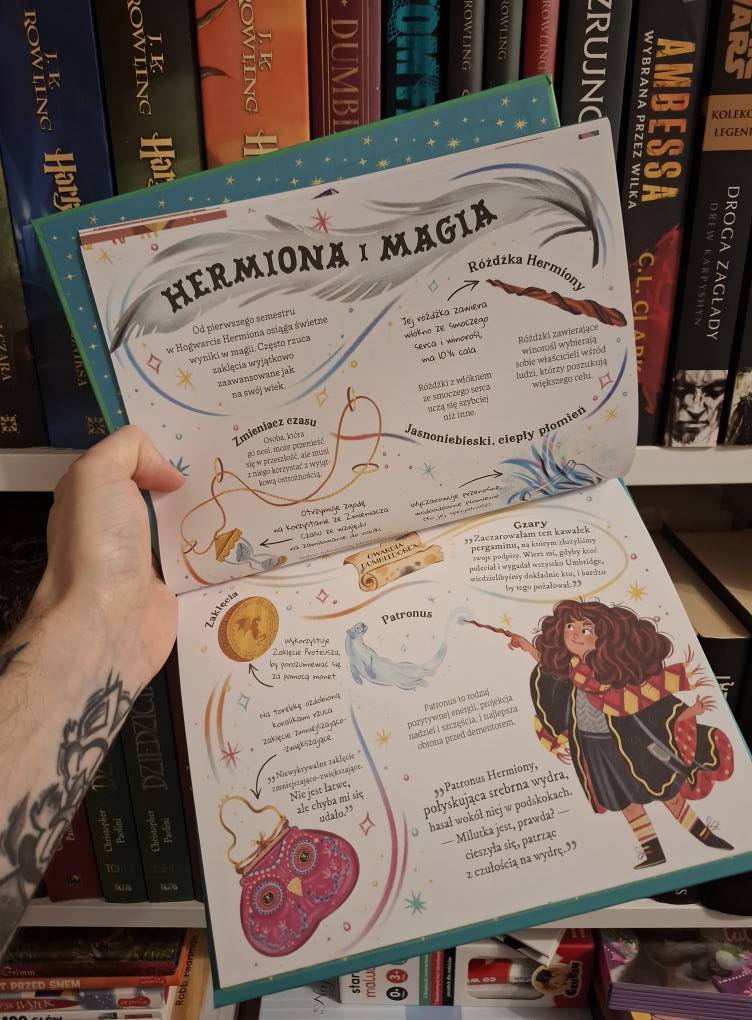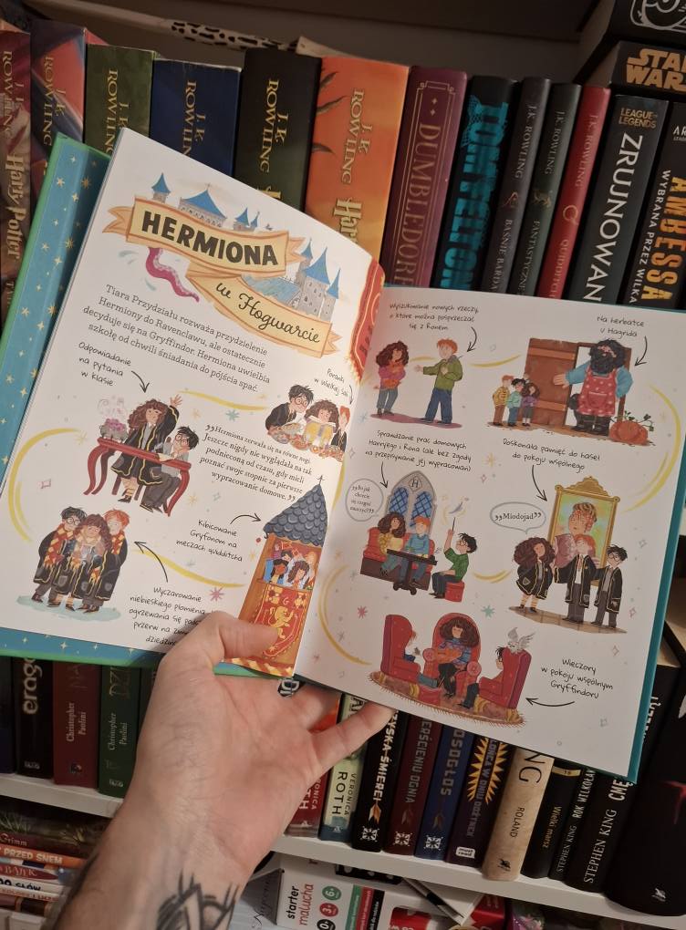Na duży plus zasługuje też to, że książeczki unikają spoilerów z późniejszych tomów. Informacje zostały tak przemyślane, by nie zdradzać kluczowych zwrotów fabularnych i nie psuć przyjemności z lektury oryginalnych powieści. Zamiast tego otrzymujemy delikatne, enigmatyczne odniesienia np. „rok szósty – kłótnia Hermiony i Rona” albo „rok szósty – walka Harry’ego z Voldemortem”. Dzięki temu przewodniki można bez obaw wręczyć nawet najmłodszym fanom, by rozbudzić w nich ciekawość i zachęcić do dalszego odkrywania magicznego świata J.K. Rowling.