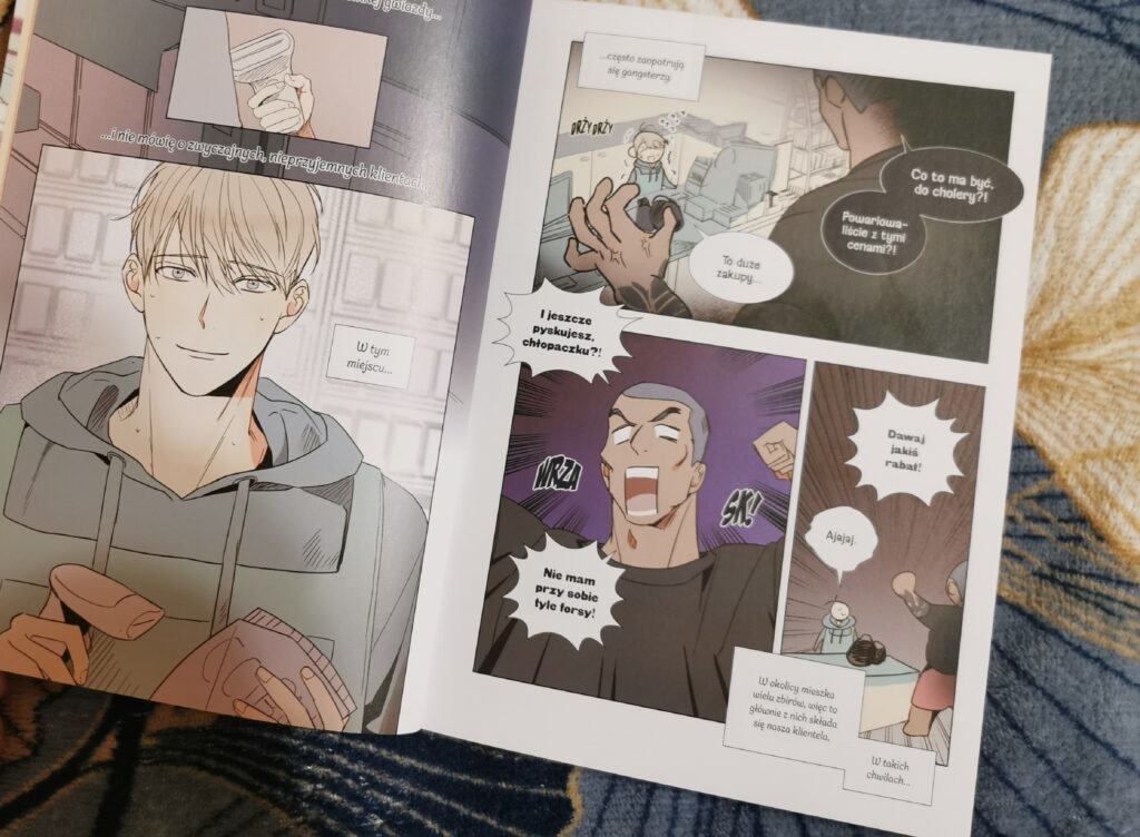 Na początku chciałabym zaznaczyć, że „Niebezpieczny sklep osiedlowy” to manhwa skierowana wyłącznie do dorosłych czytelników (18+). Już od pierwszych rozdziałów pojawiają się w niej sceny erotyczne, sugestywne dialogi oraz wątki związane z przemocą i działalnością przestępczą. Jest to historia z gatunku Boys Love/yaoi, w której relacje romantyczne i fizyczne między mężczyznami odgrywają główną rolę. Ze względu na wyraźnie zaznaczone treści seksualne i tematykę, komiks ten nie będzie odpowiedni dla osób młodszych ani dla czytelników, którzy źle znoszą odważne sceny erotyczne. Jeśli jednak akceptujesz taką konwencję i lubisz opowieści balansujące pomiędzy codziennością, niebezpieczeństwem i namiętnością, ta seria może Ci się spodobać. Osobiście sięgając po tę pozycję, dobrze wiedziałam, czego się spodziewać. Wcześniej miałam już kontakt z adaptacją anime, a tematyka Boys Love w anime i dramach nie jest mi obca, wręcz przeciwnie, bardzo ją lubię. Byłam więc przygotowana na to co znajdę w tej historii, i nie należę do osób, którym treści erotyczne przeszkadzają w dziełach popkultury.