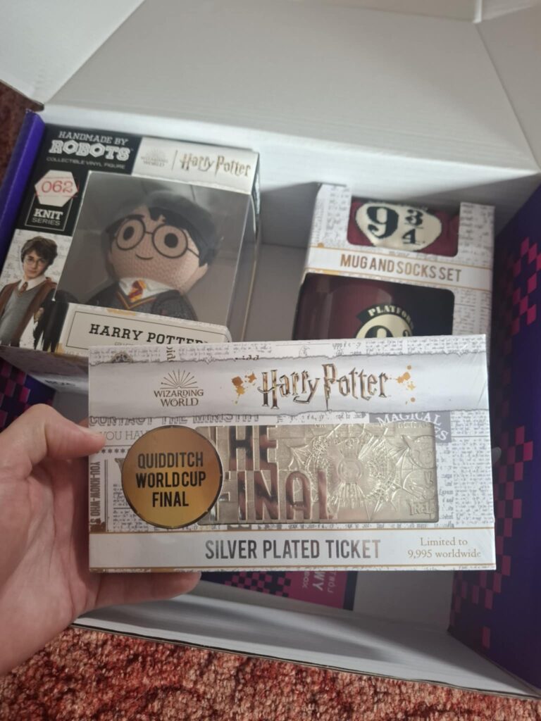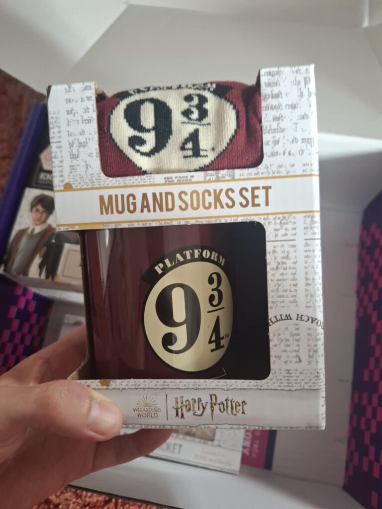 W kolejnym opakowaniu znalazłem kubek oraz skarpetki z symbolem peronu 9 i 3/4. To przykład na to, że prosty, nieprzekombinowany wzór może ładnie się prezentować. Minimalizm działa tu na korzyść. Stonowana kolorystyka i subtelna grafika sprawiają, że zarówno kubek, jak i skarpetki wyglądają bardzo estetycznie. Kubek jest pojemny, dobrze trzyma ciepło i świetnie sprawdza się w codziennym użytkowaniu. Skarpetki z kolei są długie, wygodne i przyjemne w dotyku. Jedynym drobnym minusem, który rzucił mi się w oczy, jest mniej intensywny kolor skarpetek w porównaniu do grafiki z opakowania i nadruku na kubku. Nie jest to dla mnie istotna wada, która wpływa na odbiór zestawu, ale warto ten detal odnotować.