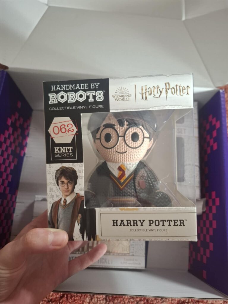 Ostatnim elementem zestawu jest figurka Harry’ego Pottera w stylu vinyl robots, stylizowana na ręcznie robioną zabawkę wykonaną na szydełku. Przyznam, że nie jestem fanem tego typu figurek. Nie przekonuje mnie łączenie imitacji szydełkowego wzoru z plastikiem. Wolę autentyczne, ręcznie wykonane przedmioty. Mimo to muszę przyznać, że figurka została bardzo dobrze dopracowana. Odznacza się charakterystycznym wzorem, a najmniejsze detale zostały wykonane z dużą precyzją. Widać to szczególnie w ułożeniu włosów, odwzorowaniu ubrań i starannym zaznaczeniu kolorystycznych przejść. Na uwagę zasługuje także malowanie. Kolory są wyraźnie odseparowane, nie ma odprysków ani rozlewania się farby, co jest szczególnie istotne przy złożonych elementach takich jak peleryna, bluza i krawat. Kolorystyka zachowana jest czysto, bez przesunięć, co tylko potwierdza wysoką jakość wykonania.