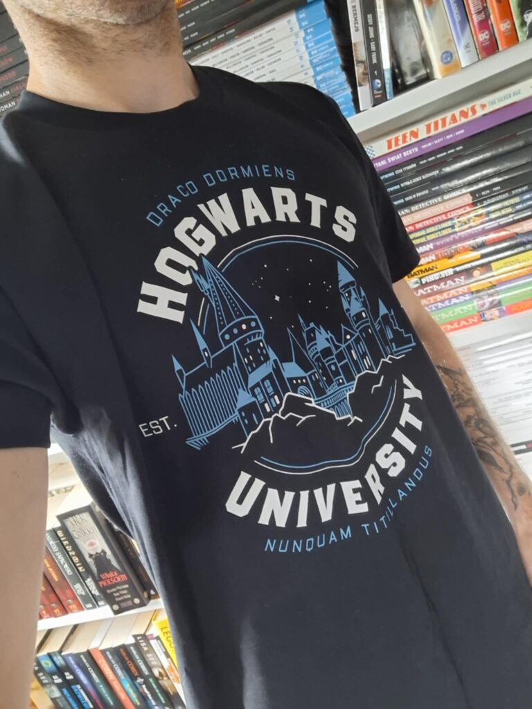 Choć nie był to pierwszy gadżet, jaki zobaczyłem po otwarciu pudełka, to w pierwszej kolejności sięgnąłem po koszulkę. Prosta grafika przedstawiająca Hogwart prezentuje się naprawdę pięknie i doskonale oddaje charakterystyczny klimat szkoły magii. Wizualnie świetnie komponuje się z czarnym tłem koszulki dzięki zastosowaniu niebieskiego koloru połączonego z symboliczną bielą, co całościowo wpisuje się w dobrze znaną estetykę serii.