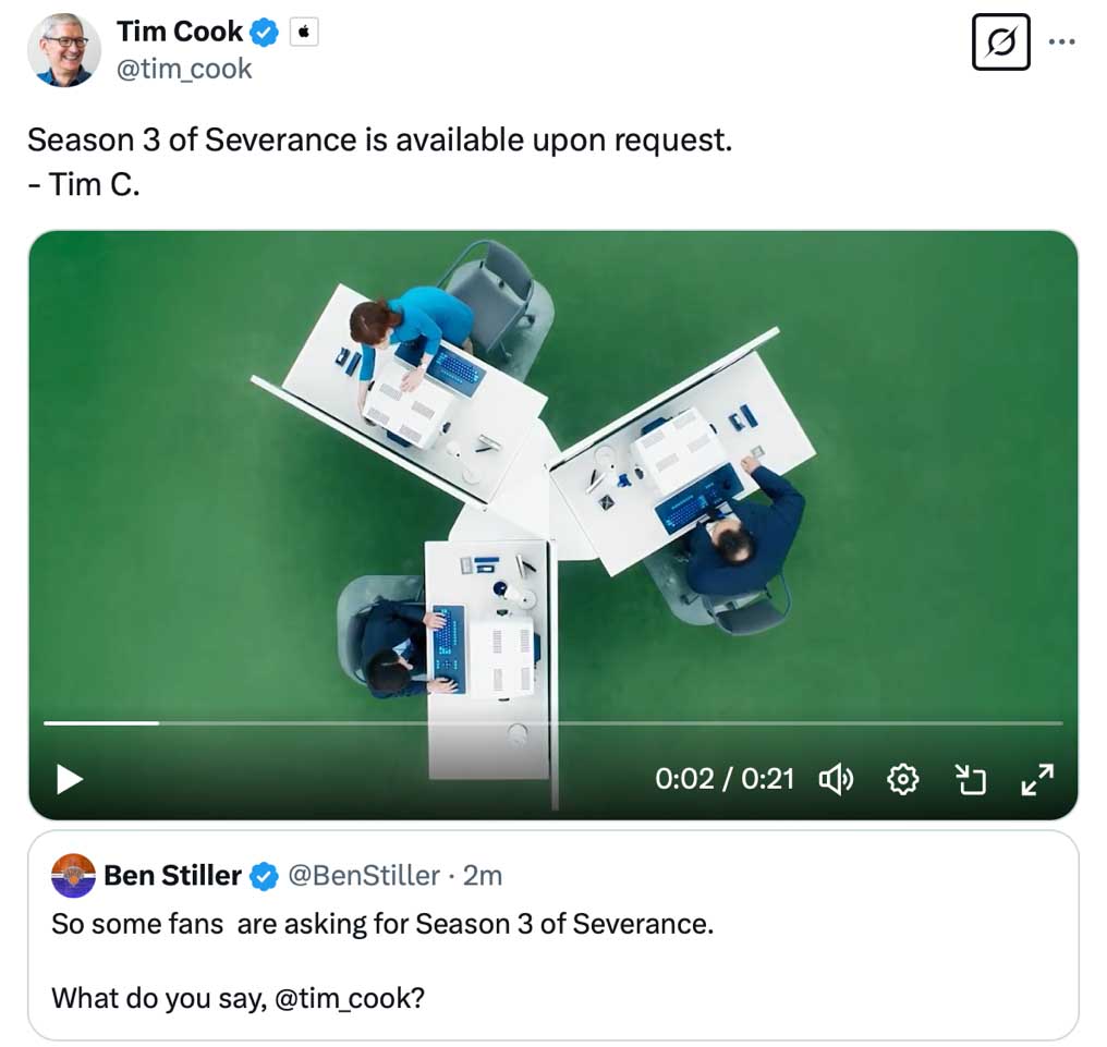 Popularna produkcja AppleTV „Rozdzielenie” powróci z kolejnym sezonem. Potwierdzono to dość zabawną rozmową Tim Cooka, CEO Apple i Bena Stillera, reżysera serialu, na platformie X.