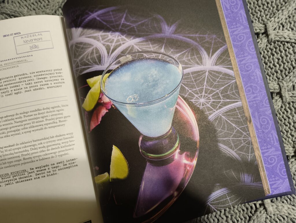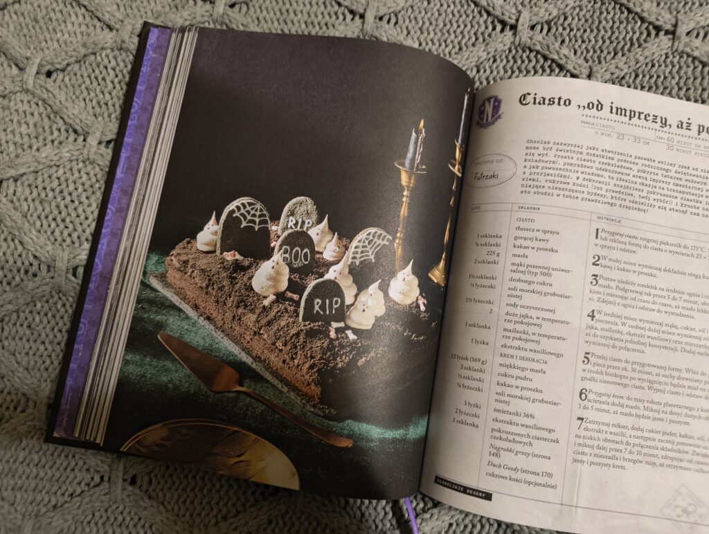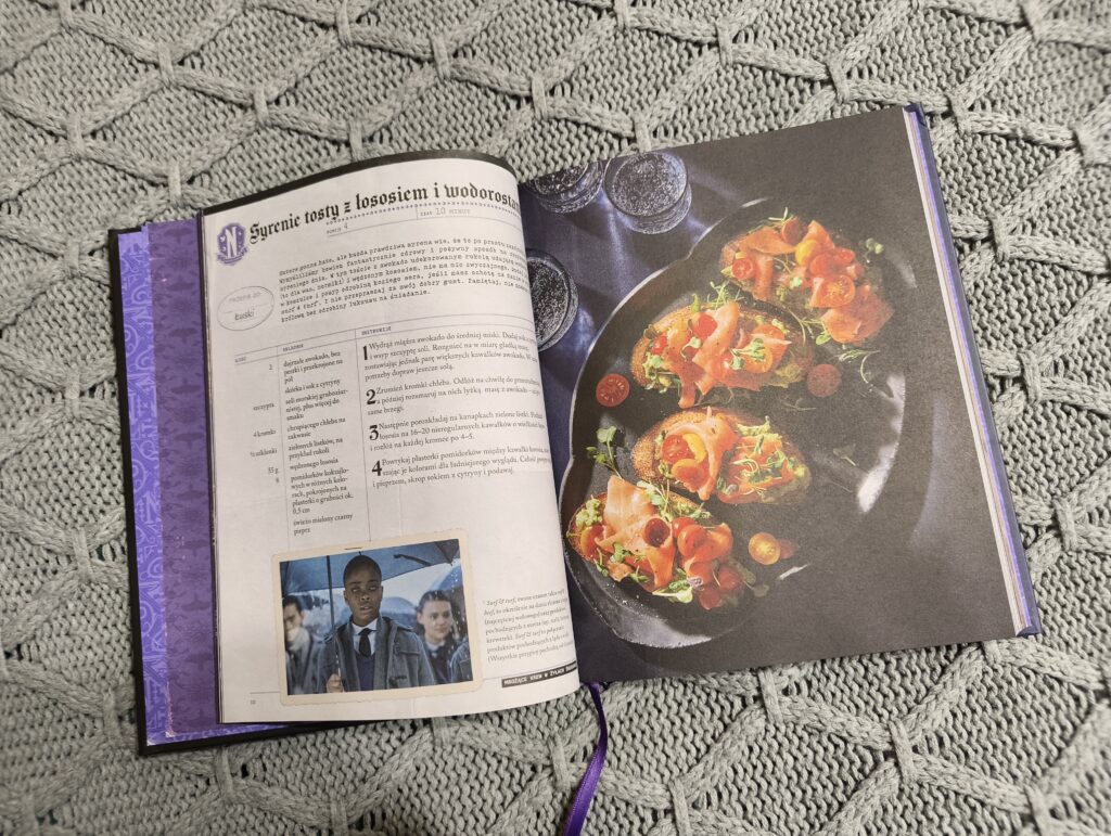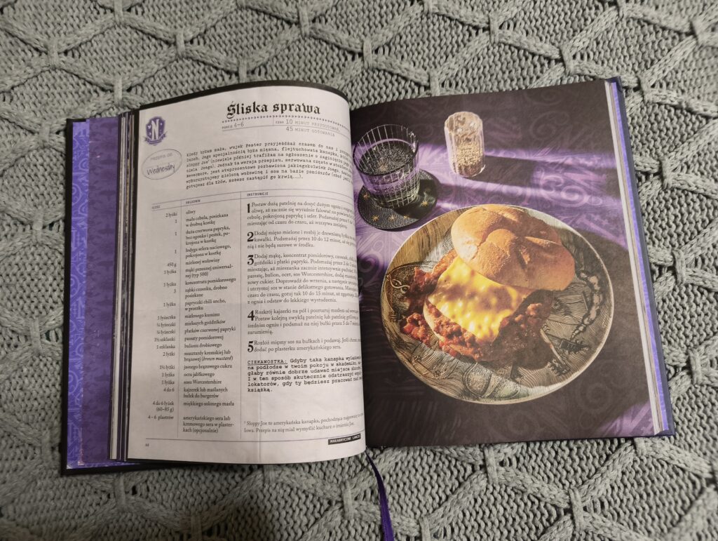 Zacznijmy szybko od wydania, które naprawdę zasługuje na sporo uwagi – nie oszukujmy się, to w książkach kulinarnych jest absolutnie kluczowy element. I tutaj muszę przyznać, że wydawnictwo Jaguar stanęło na wysokości zadania. Twarda oprawa, piękna wyklejka, tasiemka do zaznaczania stron… Wszystko to sprawia, że książka prezentuje się niezwykle elegancko. Do tego dochodzi świetna, klimatyczna szata graficzna, idealnie pasująca do serialu, pełna kadrów i narracji nawiązujących do postaci. Dla fanów Wednesday to absolutny must have, nawet jeśli tylko miałby ozdabiać półkę.