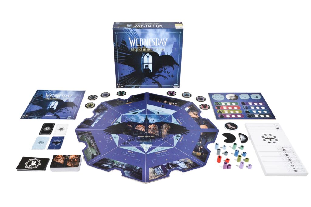 „Wednesday. Tajemnice Akademii Nevermore” to imprezowa gra towarzyska dla od 2 do 6 graczy, w której uczestnicy muszą rozwiązać kryminalną zagadkę – w Akademii Nevermore doszło do zabójstwa, a morderca ukrywa się wśród graczy. Aby wygrać, należy wskazać zarówno warunki zbrodni, jak i sprawcę oraz jego wspólnika!
