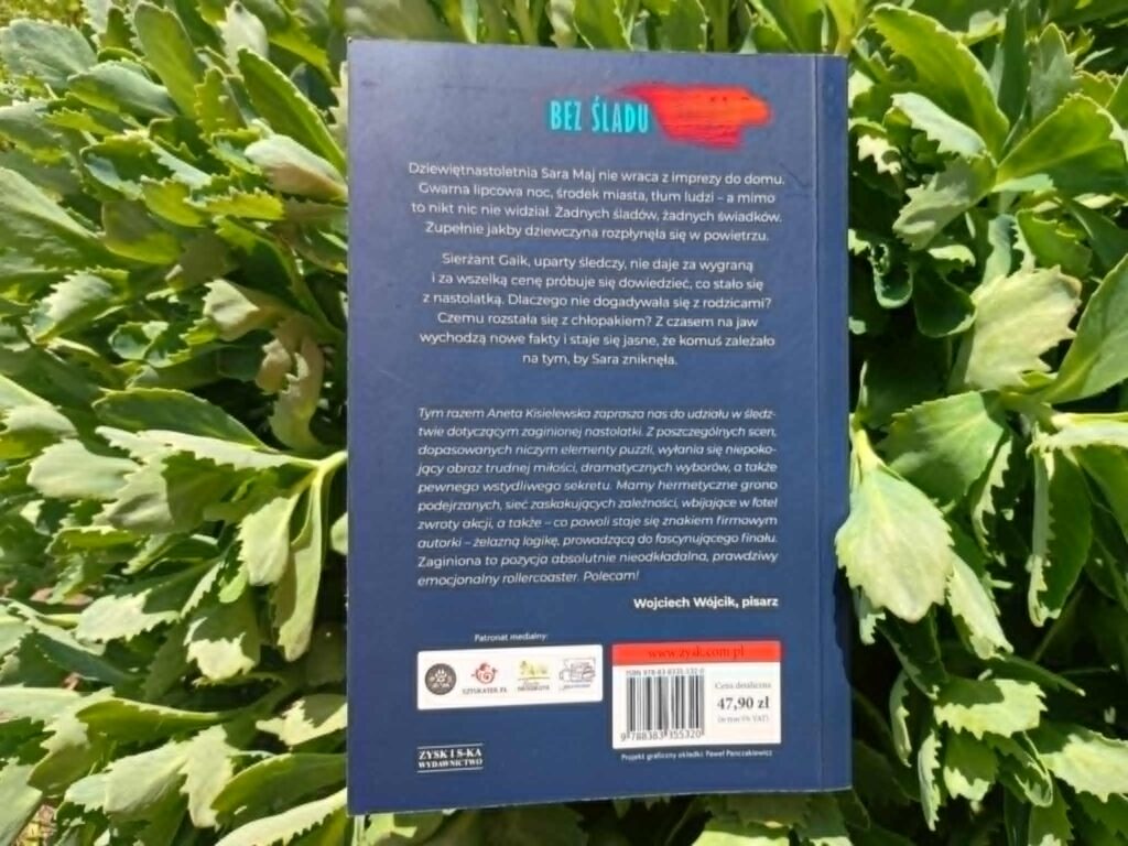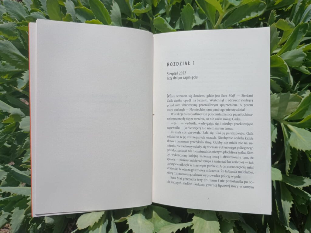 Co więcej, w książce tej nie znajdziemy niepotrzebnych bohaterów, którzy będą tylko zapychać fabułę swoją obecnością. Oczywiście w niektórych fragmentach przewijają się drugoplanowe postacie, ale jest ich tak mało, że w pełni możemy zawęzić krąg podejrzanych. Pojawia się sierżant Gaik, zaginiona – Sara Maj, jej rodzina, dwójka najbliższych przyjaciół – Piotrek i Alicja, były chłopak Dawid i jego matka Bogna. Każdy z tych bohaterów jest inny. Każdy z nich coś ukrywa. Każdy ma motyw. Bardzo mi się podoba stopniowe pokazywanie tego jacy naprawdę są bohaterowie i jakie sekrety skrywają.