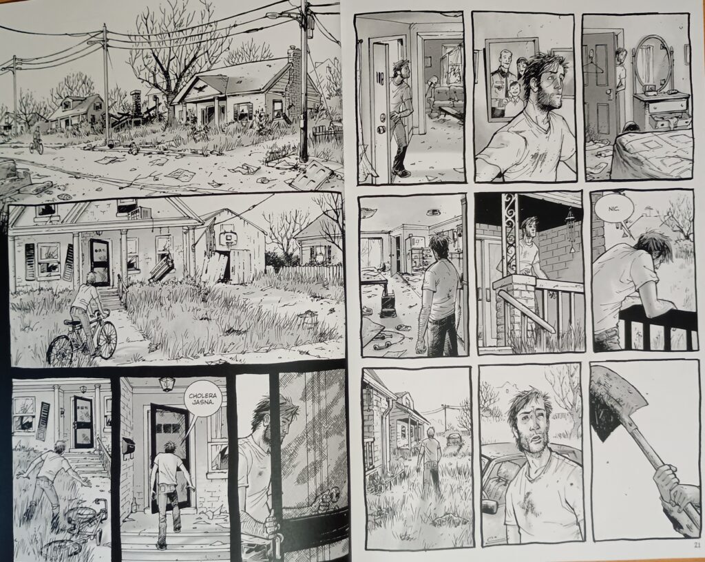 Pierwszą moją stycznością z „Żywymi Trupami” był serial, tak więc nie mogę go nie porównywać z komiksem. Odkąd w 3 odcinku pierwszego sezonu na ekranie pojawił się Daryl Dixon ten właśnie bohater na zawsze znalazł sobie miejsce w moim sercu. Miałam lekkie obawy przed komiksem, ponieważ niektórych postaci, które występują w serialu w nim ich nie znajdziemy. Komiks na szczęście jest tak interesujący, że nie odczułam braku mojego ulubionego bohatera. Postacie są bardzo zróżnicowane. Niekiedy z serialem łączy je tylko imię, bądź ich historia jest poprowadzona całkiem inaczej, niektórych na próżno szukać na papierze. Bardzo się cieszę, że mój ukochany serial nie jest kropka w kropkę jak jego papierowy pierwowzór. Komiks cechuje się niesamowitą brutalnością, większą od serialu. Wiadomo, że z zombiakami kojarzą nam się latające na każde strony wnętrzności i morze krwi, ale to jeszcze nic co oferuje nam ta pozycja. Jest brutalnie i kontrowersyjnie, ale jakby nie patrzeć to początek końca świata. Część ludzi ma za nic prawo, część znów chce na koniec zaznać miłości i mieć przy sobie osobę, z którą może się dzielić swoimi lękami. Mam nadzieję, że ten motyw tak was zaskoczy jak mnie. Rysunki niesamowicie realnie oddają realia, anatomię bohaterów, zaskakując w wielu miejscach szczegółowością oraz… brutalnością, w której rysownik w niczym się nie ogranicza, ale ma wyczucie, żeby najostrzejsze obraz podać ze smakiem.